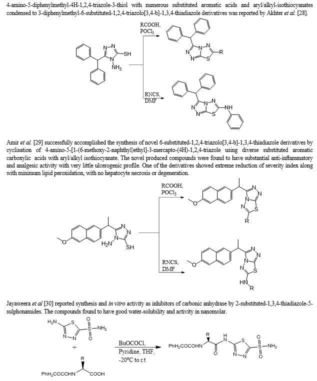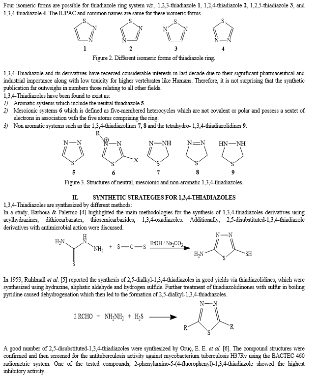 1,3,4-thiadiazole and its derivatives are prepared by a variety of methods and reaction conditions. In general, different Lewis’s acids like POCl3, PPA dry ZnCl2, etc. are commonly employed to get a good yield of 1,3,4-thiadiazole and its derivatives. Their role is highly crucial as dehydrating or cyclizing agents. The present work offered an insightful understanding of synthesis of 1,3,4-thiadiazole and its derivatives.