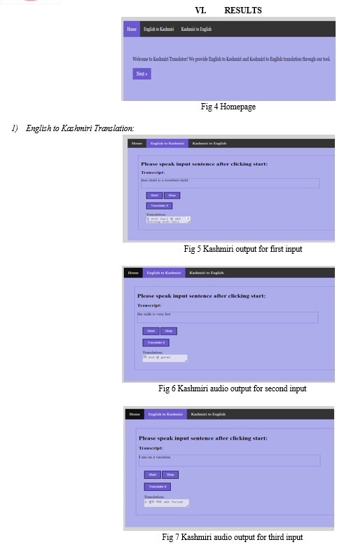 For Kashmiri to English Translation, a user can provide Kashmiri text input inside the input box and he/she gets the translated English text and audio by clicking on the “Translate it” button.