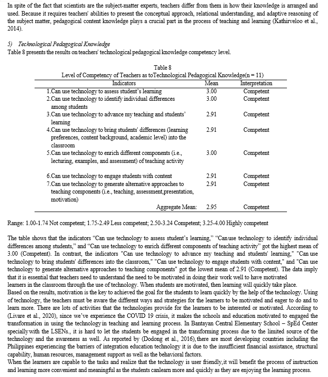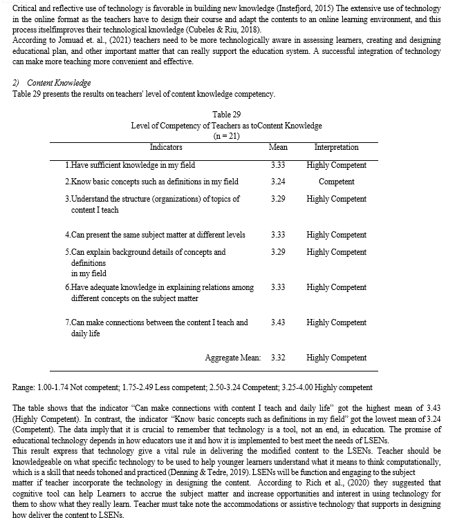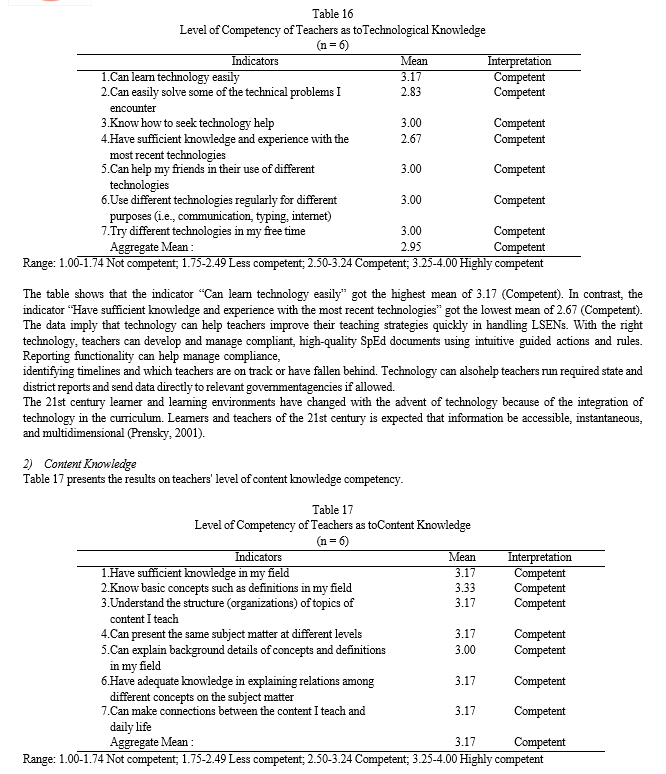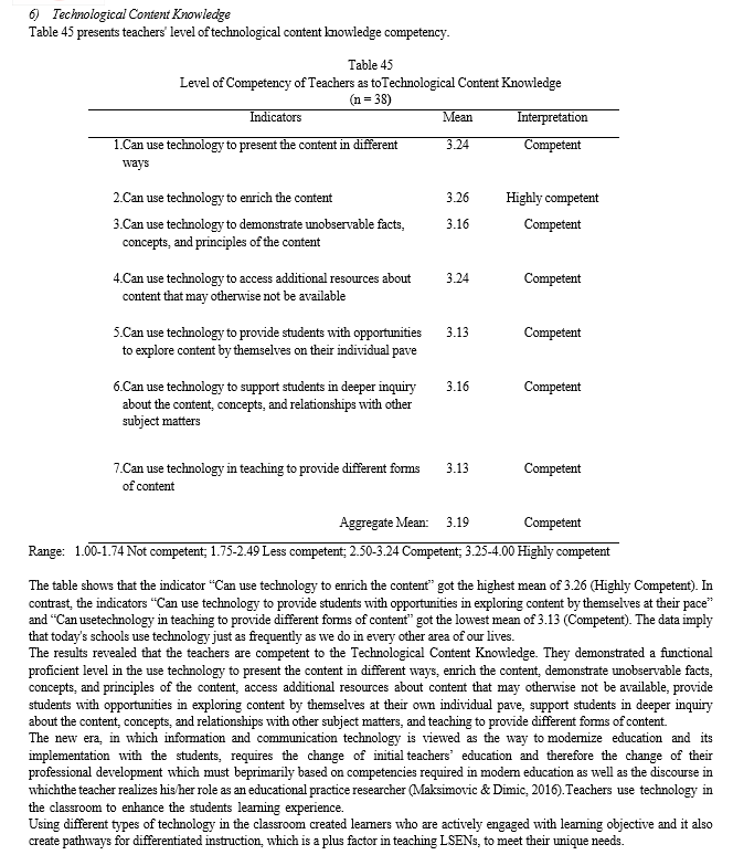 Different programmatic arrangements have been used to effectively prepare SpEd teachers, including traditional and integrated programs as well as innovative course enhancement. According to the study of Oliver, (2011); Voogt et. al., (2013); and Sang et, al., (2016), teachers should have competencies that include content knowledge, pedagogical knowledge, technological knowledge, or TPACK. It is very important to have the prerequisite skills needed to become innovative in teaching and to become an effective teacher.
