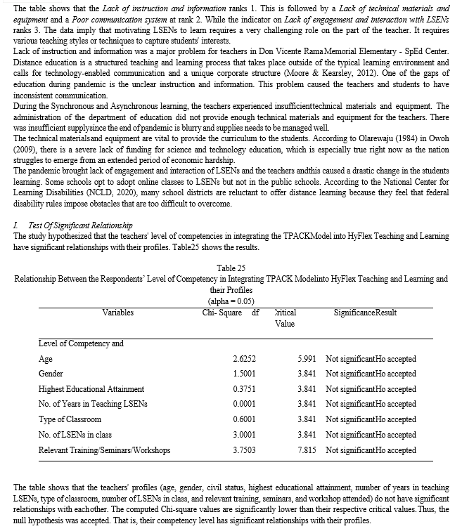 This study evaluated the level of competency of SpEd teachers and receiving teachers in integrating TPACK Model for the HyFlex teaching and learning of Learners with Special Educational Needs (LSENs) in Bantayan Central Elementary School - SpEd Center, Don Vicente Rama Memorial Elementary School - SpEd Center, and Mandaue City Central Special Education School for the school year 2022-2023 as the basis for action plans. A quantitative method was utilized in evaluating the study. A descriptive method employed with the use of an adapted instrument to gather data from 38 teacher respondents. Gathered data were analyzed using frequency, weighted mean, and Chi-square. Findings revealed that about 36.84% of the respondents are aged 30 to 39. Most teachers are handling 1 to 10 LSENs in a class. These teachers have attended 61 or more hours of training, seminars, and workshops. Teachers’ competencies in content knowledge and pedagogical knowledge got the highest mean of 3.29 (Highly Competent). The competency in technological knowledge got the lowest mean of 3.16 (Competent). The challenges encountered by the teachers are as follows; lack of network connectivity, heavy workload follows this from home, and school activity, and the indicator lack of technical materials and equipment. Therefore, teachers are competent in integrating TPACK for Hyflex mode of teaching. Hence, it is strongly recommended that the output of the study with its scheme of implementation and the action plans shall be developed by all concerned parties.