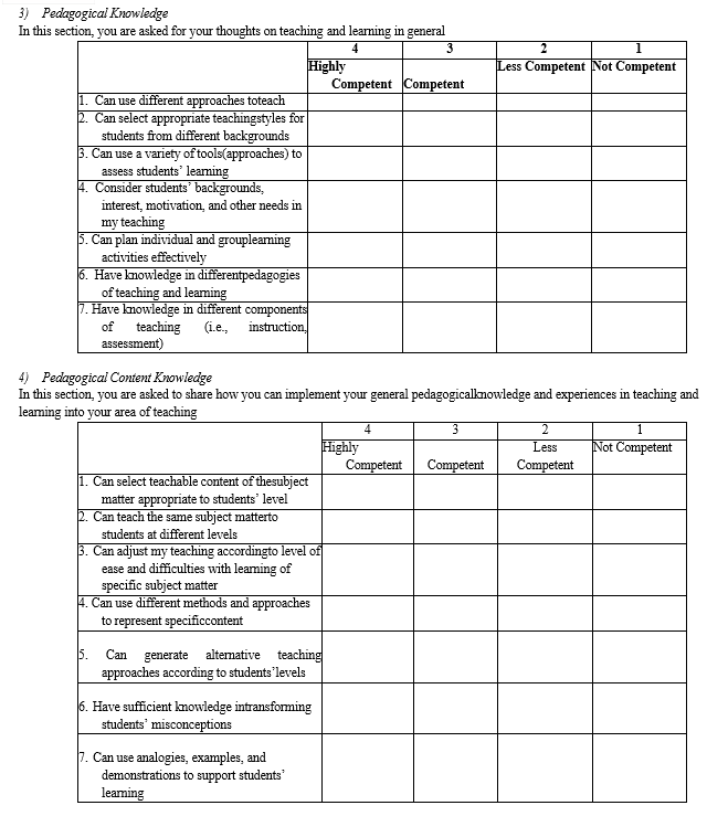 Conceptualize teachers’ ability as the teachers’ beliefs or perceptions of their own competence at teaching, use of instructional strategies, and teaching effectiveness (Farley, 2019). The flexibility of teachers in accepting their weaknesses and follow up with their evaluation results (Alcantara et al., 2018) and skill for reflection and self-analysis (Griffith, 2016) are both necessary to come up with a professional development plan that is fitted to their capacities and needs. Even classroom management and discipline matter inside the classroom are very important to address.