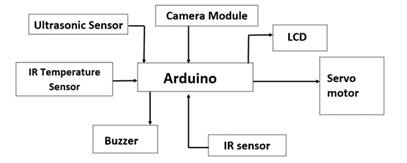 For this, microcontroller atmeg328p and esp32 camera module is being used. This system also uses ultrasonic sensor (HC-SR04),IR temperature sensor (MLX9164) and stepper motor(28BYJ-48) among all the other components. This system also uses a self-made and pretrained data set of different face types.