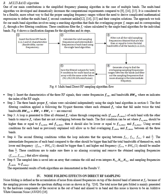 The paper is organized such that section II focuses on developing the mathematical constraints used to calculate the proper sampling frequencies in case of single and multiple RF signals, III presents the frequency planning and the MATLAB-coded single and multiple band algorithm to calculate proper sampling frequencies. IV studies the effects of noise folding on DRFS. The single and multi-band DRFS algorithms are implemented on MATLAB for L1, L2, and L5 and their results are presented in V. The design optimization is presented in VI. VII concludes the paper.