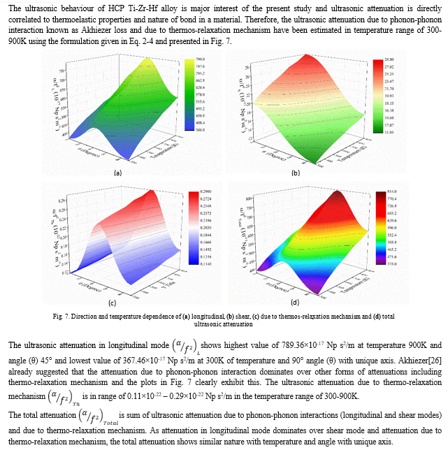 The temperature dependence of SOECS and TOECs for Ti-Zr-Hf alloy have been evaluated using Lennard-Jones potential method. The formulation for calculation of six independent SOECs and ten independent TOECs is thoroughly discussed in the literature[18]–[21]. The bulk modulus (B), shear modulus (G), Young’s modulus (Y) and Poisson’s ratio have been computed by Voigt-Reuss-Hill method[22] for hexagonal crystals. The ultrasonic velocities in longitudinal (VL), quasi-shear (VS1) and shear (VS2) modes along unique axis (c-axis) at different angles of propagation, Debye average velocity (VD) and Debye temperature (θD) can be calculated with the help of higher order elastic constants using the formulation discussed in literature[16], [18], [20], [21].