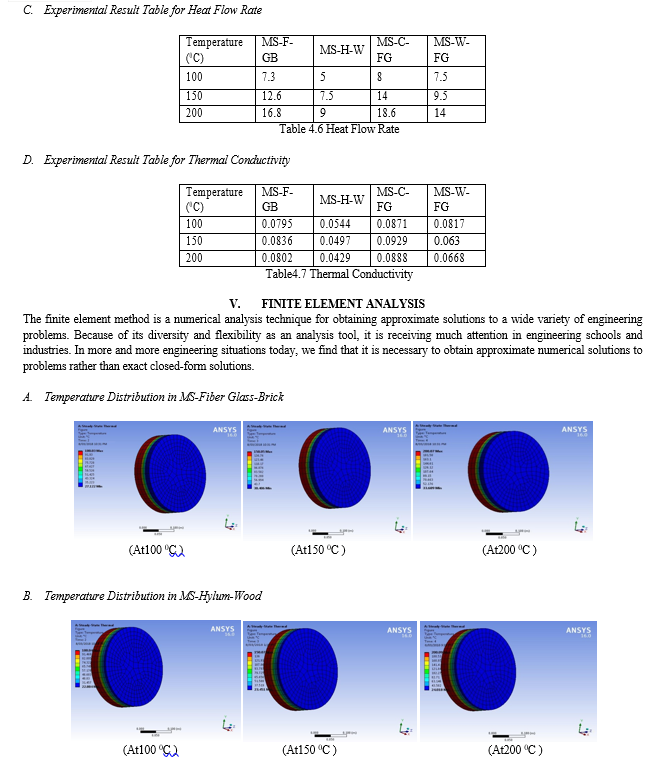 8) Then it can be concluded that the composite MS-Hylum-Wood shows lower heat flux, temperature distribution, heat flow rate, and thermal conductivity values than that of the other composites like MS-Concrete-Fiber Glass, MS-Fiber Glass-Brick &MS-Wood-Fiber Glass respectively.