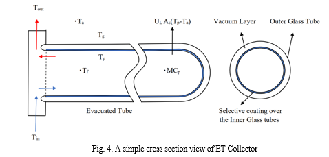 Fig. 4. shows the solar collector’s schematic diagram of a simple cross section view of ET Collector attached with a manifold through which cold fluid flow from below and heated fluid flow upward. This process of flow of hot fluid and cold fluid is basically known as thermosyphon process. The temperature distribution affect heat loss coefficient and overall heat losses from the tubes to the atmosphere, due to which hot water loses heat to the atmosphere. There were 8 temperature sensors, 4 at upper glass tubes and 4 at lower glass tubes, average values of these temperature sensors were used to calculate outer glass tube temperature.