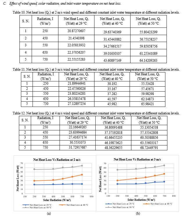 .Fig. 3. shows a complete experimental procedure which has been performed for constant inlet temperatures of 29 °C, 40 °C and 50 °C with wind speed from Low to high range. Wind velocity kept fixed at 2 m/sec for each set of constant inlet temperatures and same sets were made for the wind velocity of 3 m/sec and 4 m/sec respectively. The solar radiation has taken as 250 Watt/m2, 450 Watt/m2, 550 Watt/m, 650 Watt/m2 and 750 Watt/m2. These radiations were taken by keeping each radiation level fixed for 50 minutes and took the temperature readings at various locations for every 10 minutes.