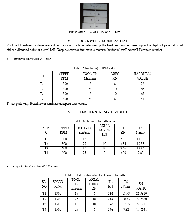 The use of polymeric materials has grown widely in various sectors such as packaging, building, electronic, automotive, and aerospace industries. Particularly, Ultra-High Molecular Weight Polyethylene has wide engineering applications and is used in large quantities in automotive oil pans, gears, slides, cams, bearings, fluid reservoirs, and the sports industry. Friction Stir Welding (FSW) is a solid-state process in joining thermoplastic materials. In this investigation, FSW process must be applied to join a UHMWPE plate of 8 mm thickness with specially designed hexagonal tool pin profile. The aim of this study is to examine the effect of main friction stir welding (FSW) parameters on the quality of UHMWPE plate welds. FSW machine, using a tool with a stationary shoulder and no external heating system. The welding parameters studied were the tool rotational speed which varied between 1300 and 1500 (rpm); the traverse speed which varied between 15 and 25 (mm/min), and the axial force ranging from 8 to 10 (KN). Good quality welds are achieved without using external heating, when the tool rotational speed and axial force are above a certain threshold. For high rotational speed and axial force welds have poor material mixing at the retreating side and mild voids at the nugget, tensile strength also obtained very poor. The hardness angle distortion and bead geometry also evaluated. Taguchi design optimum parameters and ANNOVA were found.