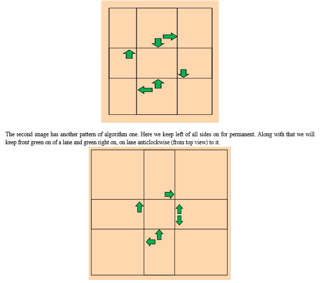 Our first algorithm works on multiple lanes opening concepts. The algorithm’s main purpose is to substitute image processing model in rush hours so that the paradox we talked earlier would not happen. In this algorithm we open partial signal of more than one lane and clear traffic of two or more lanes at a time. A full signal of a lane means you turn green forward, right and left for a lane at once. By partial signal we mean we would only turn either of forward green, left green, right green in a single lane or any of their combination. For first image we turn forward green of any two lane in opposite direction and turn green left of all directions.