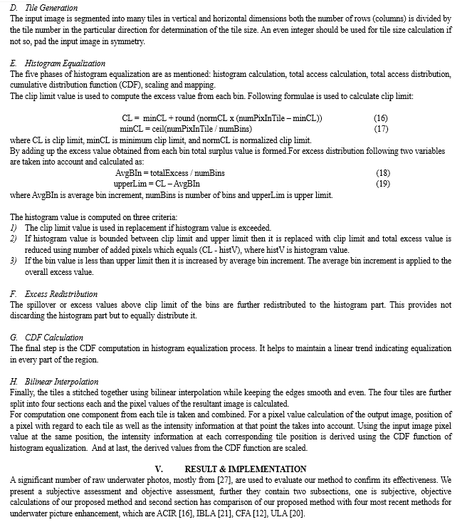 Our proposed method has successfully applied three different algorithm which are Adaptive Colour Correction, Unsharp Masking, and at the last Contrast-Limited Adaptive Histogram Equalization (CLAHE) all these are collectively used to improve the image quality through a combination of subjective and objective evaluations. Several real-world underwater images are provided as input and subjective evaluation depicted our results visually, whereas objective comparisons have been done on the basis of four quantitative measures like UIQM, UCIQE, PCQI and IE have demonstrated significant progress. The foundation for future image enhancement techniques, we will parameters refer to other robust algorithms which aim to strike a balance between perceived quality of the image and values of parameters