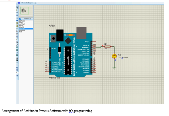 The 3D Viewer module allows the board under development to be viewed in 3D together with a semi-transparent height plane that represents the boards enclosure. STEP output can then be used to transfer to mechanical CAD software such as Solidworks or Autodesk for accurate mounting and positioning of the board. Proteus successfully fits all the requirements of the project and will be soon used to run the simulations for the sensors. For the time being, a trial run was done for the software for a simple LED blinking code with Arduino, the details are shown in the images below.