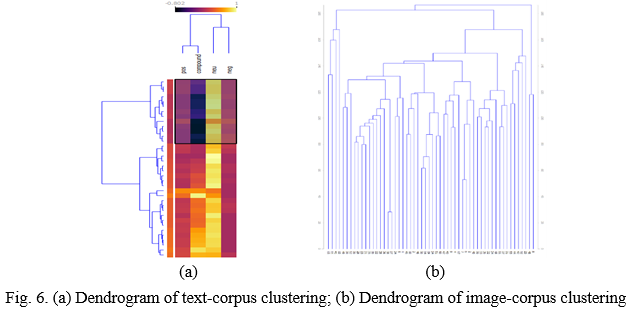 The feature vectors computed through image embedding, upon which the clustering algorithm is applied through the Euclidian distance metrics, produced a dendrogram upon the hierarchical clustering, as shown in Fig. 6 (b). A closer look at six sample clusters with their corresponding image grids are as presented earlier in Fig. 5. Cluster (a) with a 10*9 matrix grid, is representative of the three events being addressed by the Facebook users whose posts were captured. On the grid, images are clustered with obvious similarities in their infographic, colorization, genetic make-up, elements captured etc. Observation shows grid (b) 5*5 matrix cluster is composed of blood-stained images supposedly attached to text-posts discussing the controversial #LekkiMassacre while the scattered grid (c) cluster, with large white space surface area between rows and columns, is made up of synthetic graphics obviously created with photo editors. Close observation shows graphics presented on the first row of the grid has traces of the green-white-green Nigerian flag and the pair on the other row has deep red-colour of a scarf and cap respectively. Grids (d)-(f) of 6*5, 1-row, and 7*7 matrixes of close proximity on the image-input cluster are mainly composed of images over the #EndSars protests across the country. The grids are sub-clusters of a bigger branch on the dendrogram.