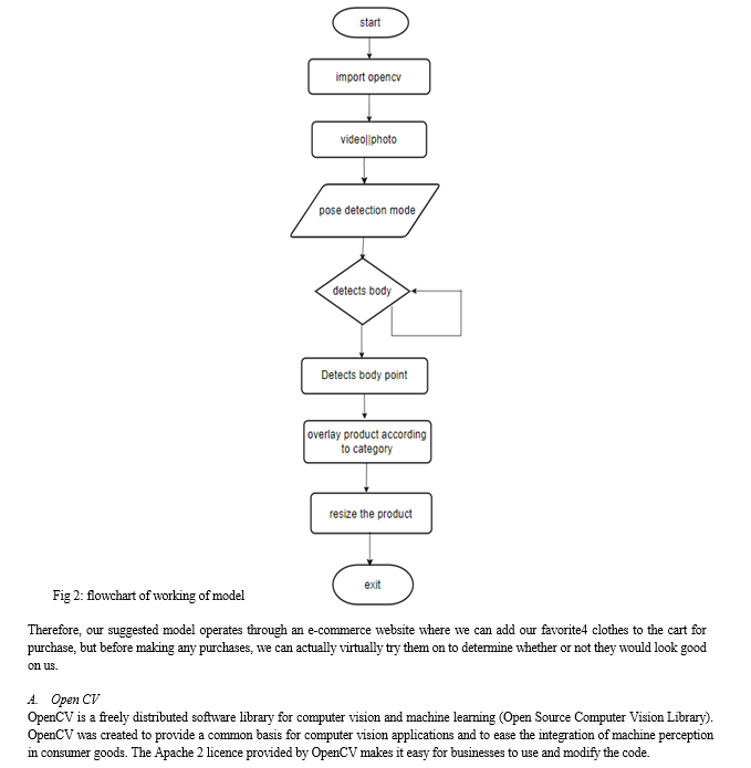 Some drawbacks of the current generation of virtual try-on clothing solutions were covered in the Section. Our goal with the suggested method is to develop a system that lets the user try on several outfits from the first picture that is taken using a computer or mobile device's camera. For this effort, Open-CV and Python programming are used. Following the building stage, a few key body locations are identified in order to estimate the parameters for the garments fitting phase. To place the selected clothing correctly on the rebuilt mesh, the size, translation, and orientation are computed for a database of different eyewear models. Let's take a closer look:
