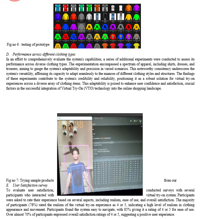 We are offering customers a real-life experiment through our model, but there are some points or, as we might measure it, limitations where there is room for further improvement. There is no doubt that websites that offer virtual trials are necessary in today's world. The length of time it takes for clothing to adapt to a user's body, improving fit accuracy, and moving from try trials to actual experiments are all things that need to be observed. In the future, we plan to enhance our virtual try-on system by incorporating machine learning-based fashion recommendation algorithms to suggest clothing combinations that match a user's style and preferences. Additionally, we will continue to collect user feedback to refine and optimize the system further.