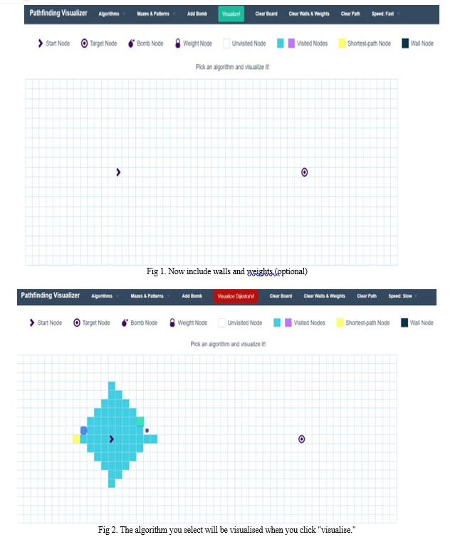 Both experienced and new programmers can benefit from using this tool to better understand algorithms. It is a web application with a 19x55 grid with start and end nodes that may be placed anywhere on the grid by the user. Walls and weights can also be added by the user to build a realistic habitat. Choose an algorithm and use it to illustrate how the chevalier algorithm functions once you have constructed the grid. The speed of the algorithm can be investigated, and the user can watch how long it takes to complete a task.