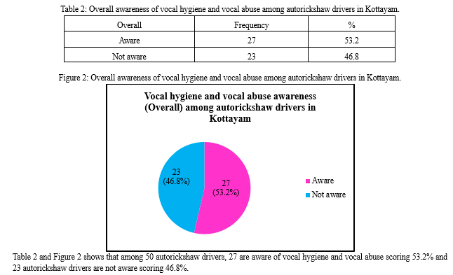 It is essential to spread awareness among autorickshaw drivers in order to enhance quality of life through avoiding voice problems. Cynthia et.al., (2022) did a study on relationship between vocal hygiene awareness and voice function among teachers in selected public primary schools in Migori County, Kenya and the results showed that majority of the teachers were aware of vocal hygiene. It was also observed that as awareness of vocal hygiene increased vocal function problem reduced.