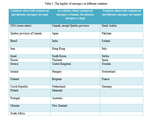 Commercial surrogacy is permitted in several nations, including some American states, Washington DC, Illinois, California, Oregon, Arkansas, Maryland, and New Hampshire as well as other nations like Poland, Russia, and many others. In addition, several nations, like India, Australia, Japan, and many others, have legalized altruistic surrogacy while outlawing commercial surrogacy [19]. Finally, some nations outlaw surrogacy in all forms, as in (Table 1).