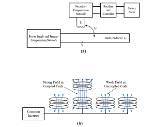 Dynamic charging systems can help further reduce the size of the battery pack on a vehicle and offer the vehicle more convenience and flexibility. There are two kinds of coil structure used in dynamic charging systems for EVs. The major difference between the two coil structures is on the primary coil side: one uses the single-coil design (a long track loop that can still be considered as a coil because of its working principle) shown in Figure 4 (a) and the other employs the segmented-coil design shown in Figure 4 (b).
