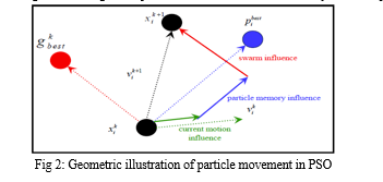 Particle Swarm Optimization (PSO), conceptualized by Eberhart and Kennedy in 1995, stands as a population-based optimization technique. In this method, particles, representing potential solutions, traverse the problem space by mimicking the movement of the current optimum particles. Each particle maintains its coordinates in the problem space along with the best solution (fitness) it has attained thus far, termed as pbest. Additionally, PSO tracks another crucial metric: the best value achieved by any particle in the swarm, denoted as gbest. Each particle dynamically adjusts its velocity based on its individual flying experience (pbest) and the collective experience of the swarm (gbest), aiming to guide the population towards more favorable solution regions. Operating within a D-dimensional search space, each particle is akin to a volume-less entity. The manipulation of particles follows a set of equations, orchestrating their movement towards optimal solutions.
