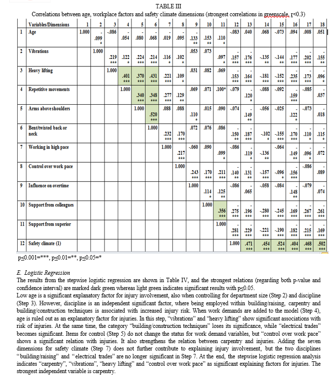 Discipline has shown an independent association with injuries, with carpentry having the strongest association. Safety climate has changed the importance of discipline, where only carpentry has shown a significant increased risk for injury involvement in the full model (all 7 steps).