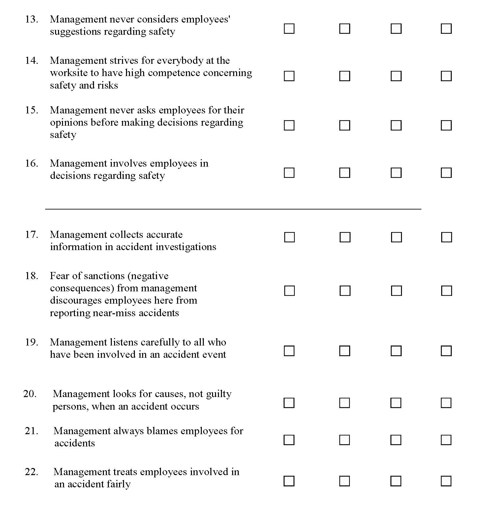 Many studies investigating the impact of safety climate on accident use different measures made up of different dimensions, and this limits the generalizability of the findings. Nielsen et al., (2008) used a Danish safety culture questionnaire composed of leadership, organizational and worker factors.